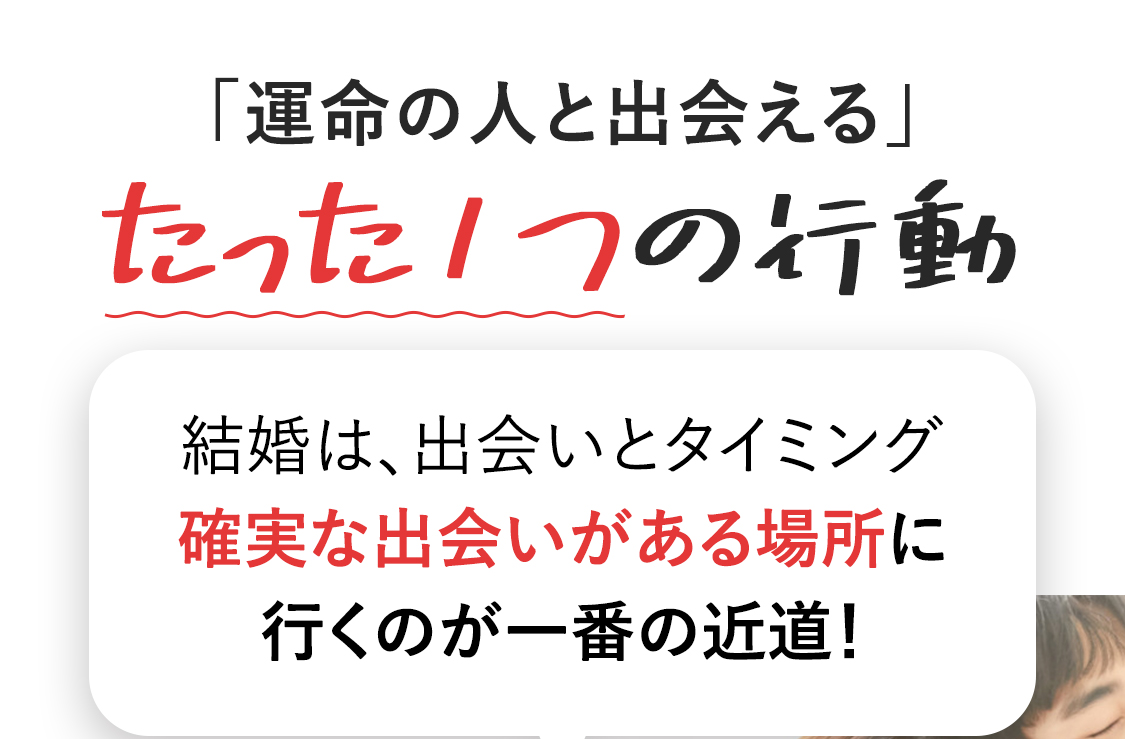 出会いはたくさんあったとしても、相手もあなたを好きで結婚したいと思ってくれる人となれば、相手の選別も必要になります。また、結婚となると相手の経済力や性格など様々な要因もしっかり検討しないといけません。出会い系アプリでは、そういった「しっかりとした情報」の選別ができないのが現実。その先に行くには、確実な行動が必要なのです。